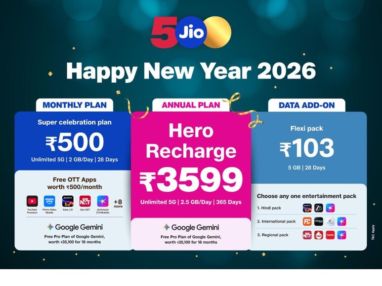 रिलायंस जियो के प्रीपेड ‘Happy New Year 2026 Plan’ के साथ Jio ने एक नया अनुअल प्लान और एक डेटा ऐड-ऑन (Flexi Pack) भी पेश किया है. इन सभी प्लान की खास बात ये है कि इनमें Google Gemini Pro AI सब्सक्रिप्शन और कई पॉपुलर OTT प्लेटफॉर्म्स का एक्सेस फ्री में मिल रहा है.
