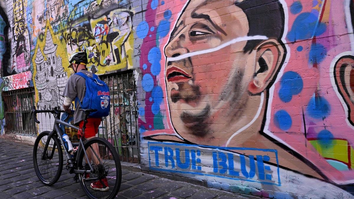 A man passes a mural by Jarrod Grech of Ahmed al Ahmed, the hero who was filmed tackling and disarming one of the attackers in the Bondi Beach mass shooting, in a Melbourne laneway on December 22, 2025.