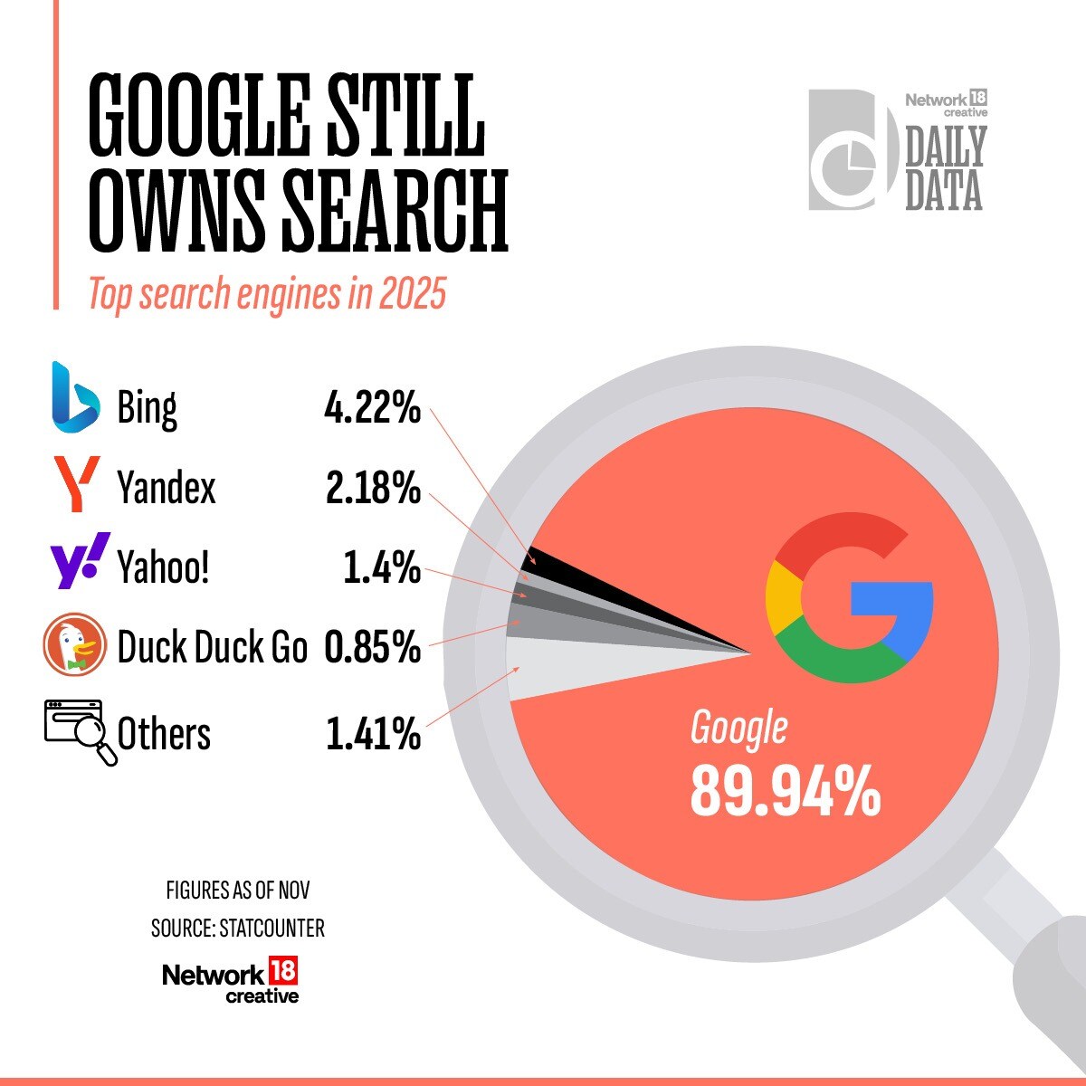Google का ग्लोबल सर्च मार्केट शेयर नवंबर 2025 में 89.94 प्रतिशत पहुंचा गया. बाकी सर्च इंजन इसके आसपास भी कहीं नहीं है. दूसरे स्थान पर 4.22 फीसदी मार्केट शेयर के साथ माइक्रोसॉफ्ट का बिंग है. केवल 10 परसेंट मार्केट शेयर में बाकी सारे सर्च इंजन सिमटे हुए हैं.
