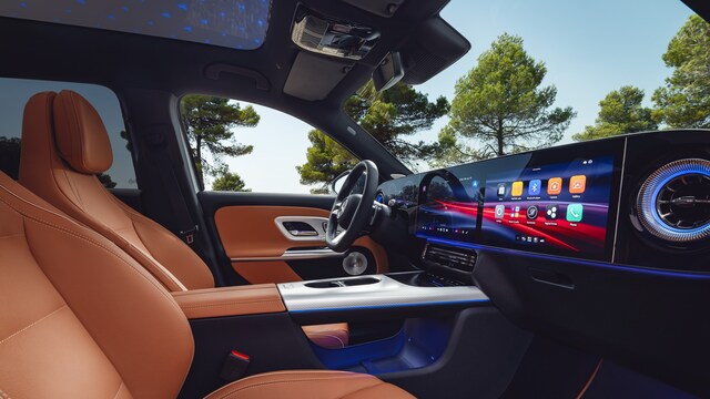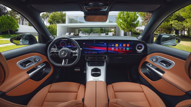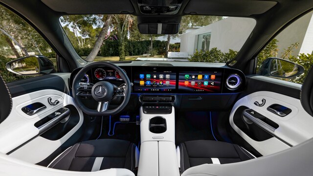 Superscreen tech: The dashboard can be fitted with the MBUX Superscreen, combining a 10.25 or 12.3-inch driver display with dual 14-inch touchscreens under one glass panel. It runs the new MB.OS with fourth-generation MBUX, over-the-air updates and a game-engine graphics system. An AI assistant using ChatGPT, Microsoft and Google technology handles natural speech and Google Maps-based electric route planning.