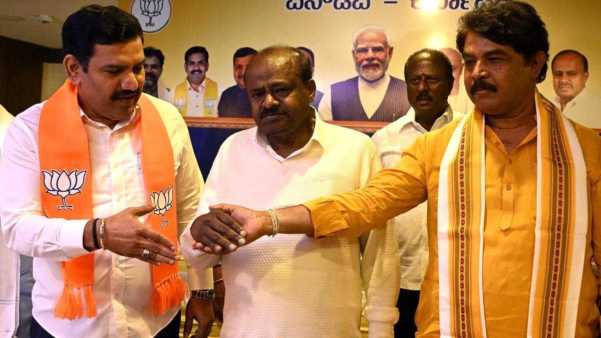 Union Minister of Heavy Industries and Public Enterprises H. D. Kumaraswamy, BJP Karnataka State president B.Y. Vijayendra, Leader of the Opposition of the Karnataka Legislative Assembly R .Ashok during press conference in Bengaluru on Saturday.