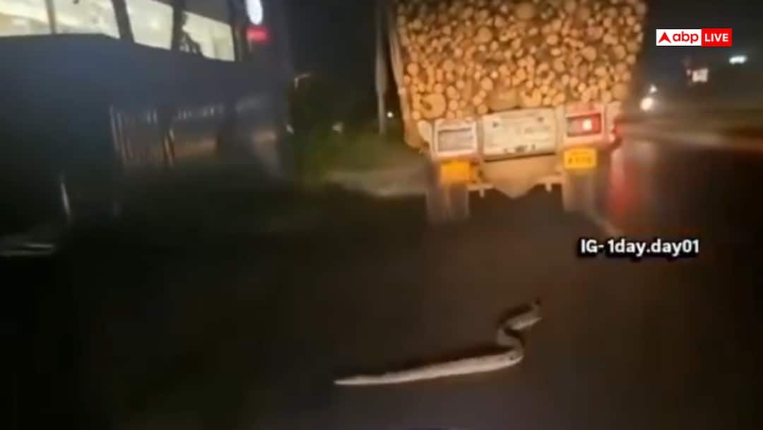 Python Viral video: सोशल मीडिया पर एक चौंकाने वाला और मजेदार वीडियो वायरल हो रहा है. जिसे देखकर लोग परेशान भी हैं और हंस भी रहे हैं. वीडियो में साफ दिखाई पड़ता है कि एक ट्रक सड़क पर चल रहा है, जो ऊपर से पूरी तरह से लकड़ियों से भरा हुआ है. ट्रक अपनी गति में आगे बढ़ रहा है, तभी अचानक लकड़ियों के बीच छिपा एक अजगर सीधे चलती ट्रक से धराम से सड़क पर गिर जाता है.