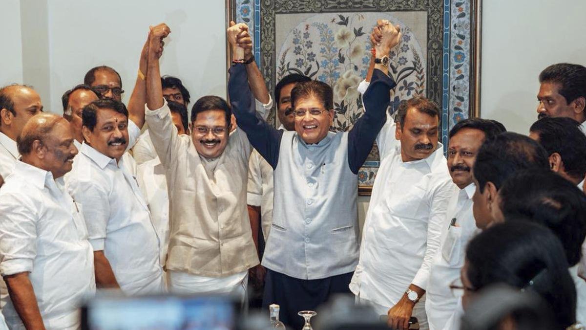 Union Minister Piyush Goyal (centre) with AMMK president T.T.V. Dhinakaran after the latter joined the NDA in Chennai.