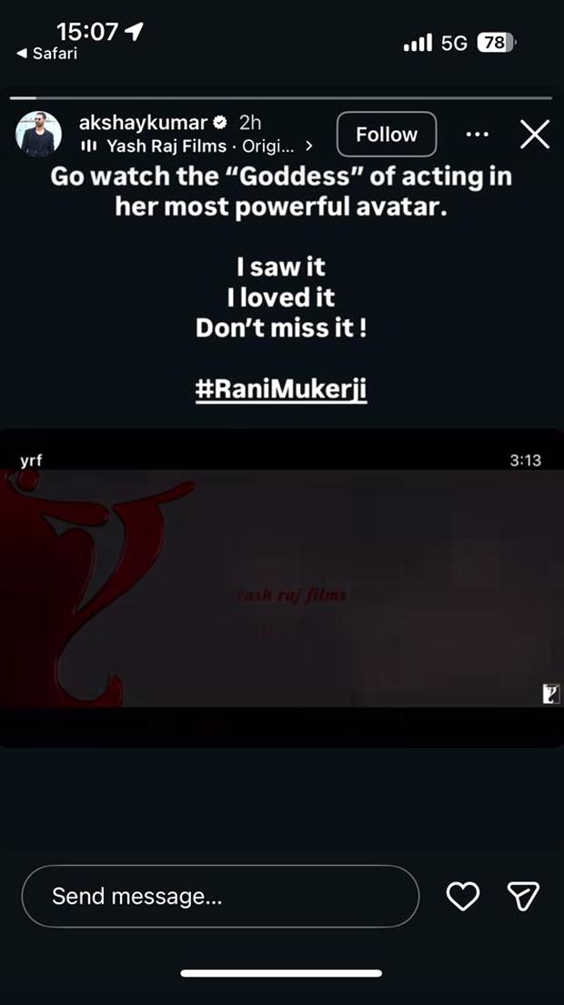 Akshay Kumar calls Rani Mukerji “Goddeess of acting” as he reviews Mardaani 3: “I saw it. I loved it.”