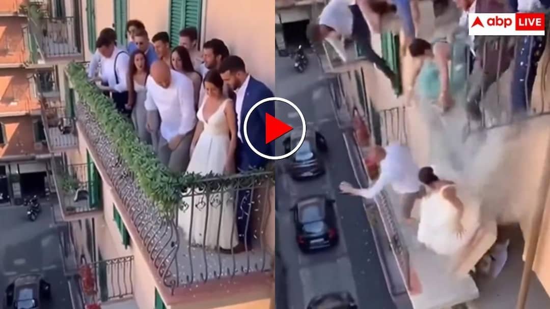 वायरल वीडियो में देखा जा सकता है कि एक इमारत की बालकनी में दूल्हा दुल्हन समेत कई लोग खड़े हैं. सभी खुश नजर आ रहे हैं और नीचे मौजूद लोगों को हाथ हिलाकर अभिवादन कर रहे हैं. माहौल पूरी तरह जश्न का है. तभी अचानक बालकनी का अगला हिस्सा कमजोर पड़ता है और कुछ ही सेकंड में पूरी बालकनी नीचे गिर जाती है. देखते ही देखते दूल्हा दुल्हन और मेहमानों का संतुलन बिगड़ जाता है और सभी नीचे गिरते नजर आते हैं. यह दृश्य इतना तेजी से घटता है कि किसी को संभलने का मौका तक नहीं मिलता.