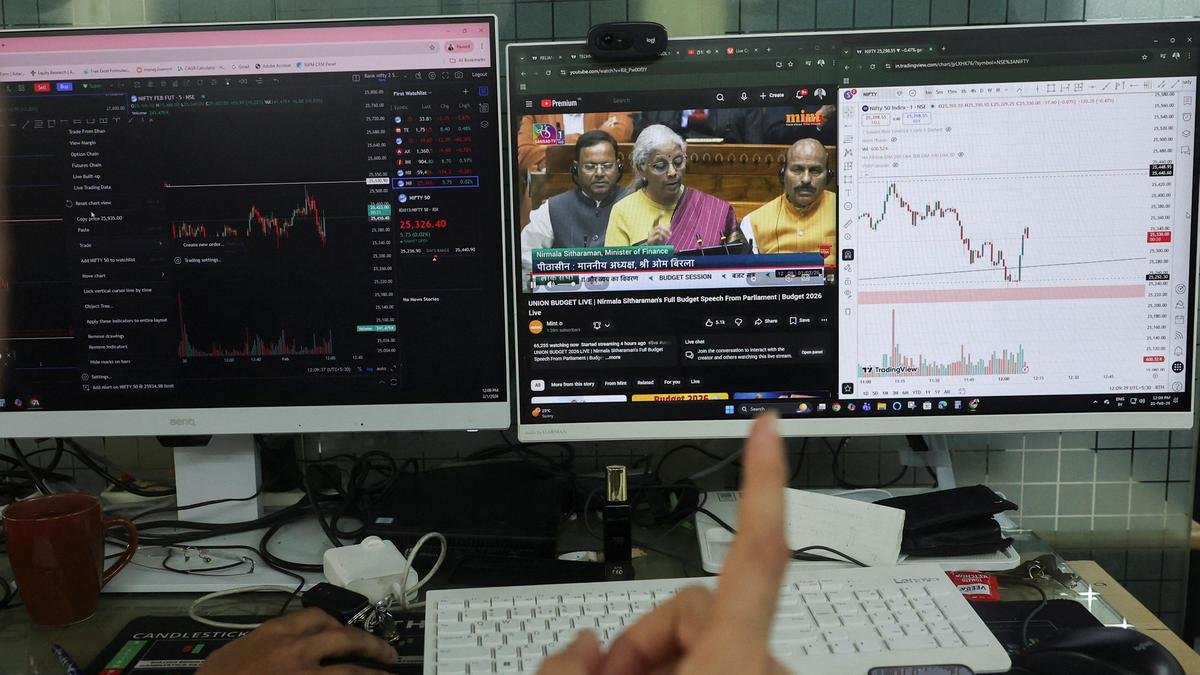 Stock traders watch Finance Minister Nirmala Sitharaman present the budget as they trade at their terminals at an office in Mumbai on February 1, 2026.