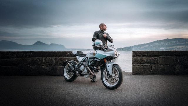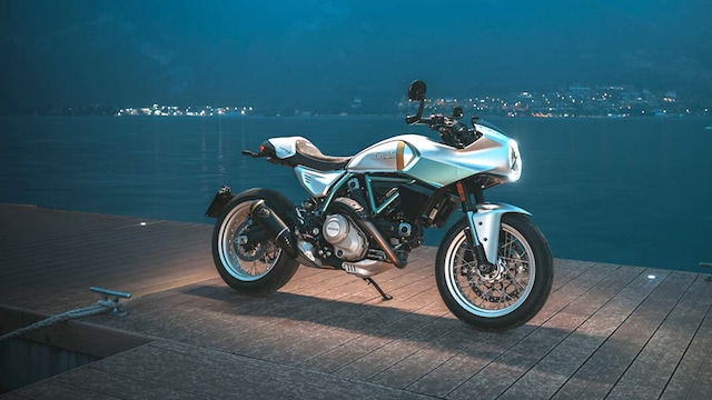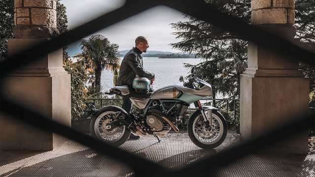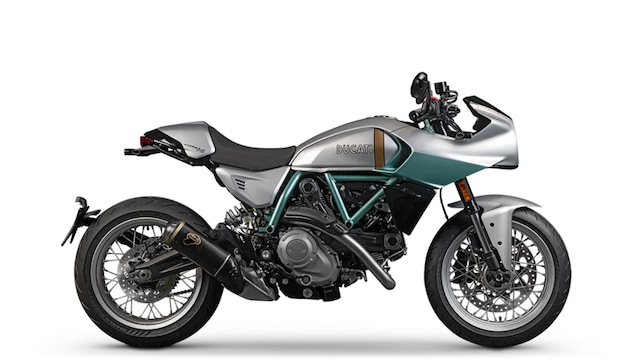 Heritage Design: The motorcycle adopts a silver and aqua green livery inspired by the original Super Sport Desmo, with a vertical gold stripe on the fuel tank referencing the unpainted strip used on the Imola race bike to check fuel levels. Café racer elements include clip-on handlebars with bar-end mirrors, a short tapered fairing, a sculpted tank and a clean rear section.