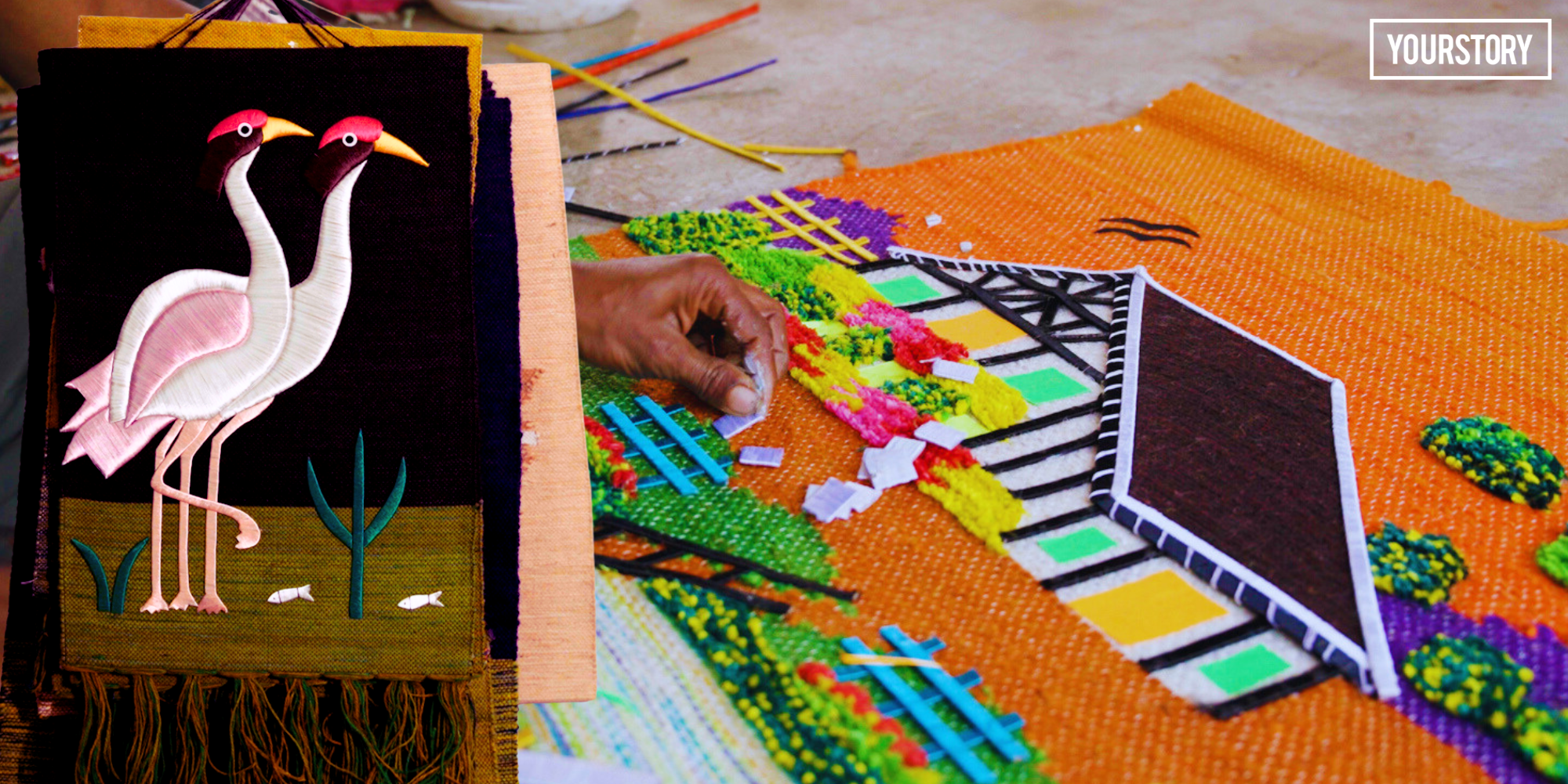After weaving, pieces are sorted and moved to finishing. Women artisans handle stitching, patching, cleaning, and final assembly. For wall hangings, rods and fittings are attached before packaging.