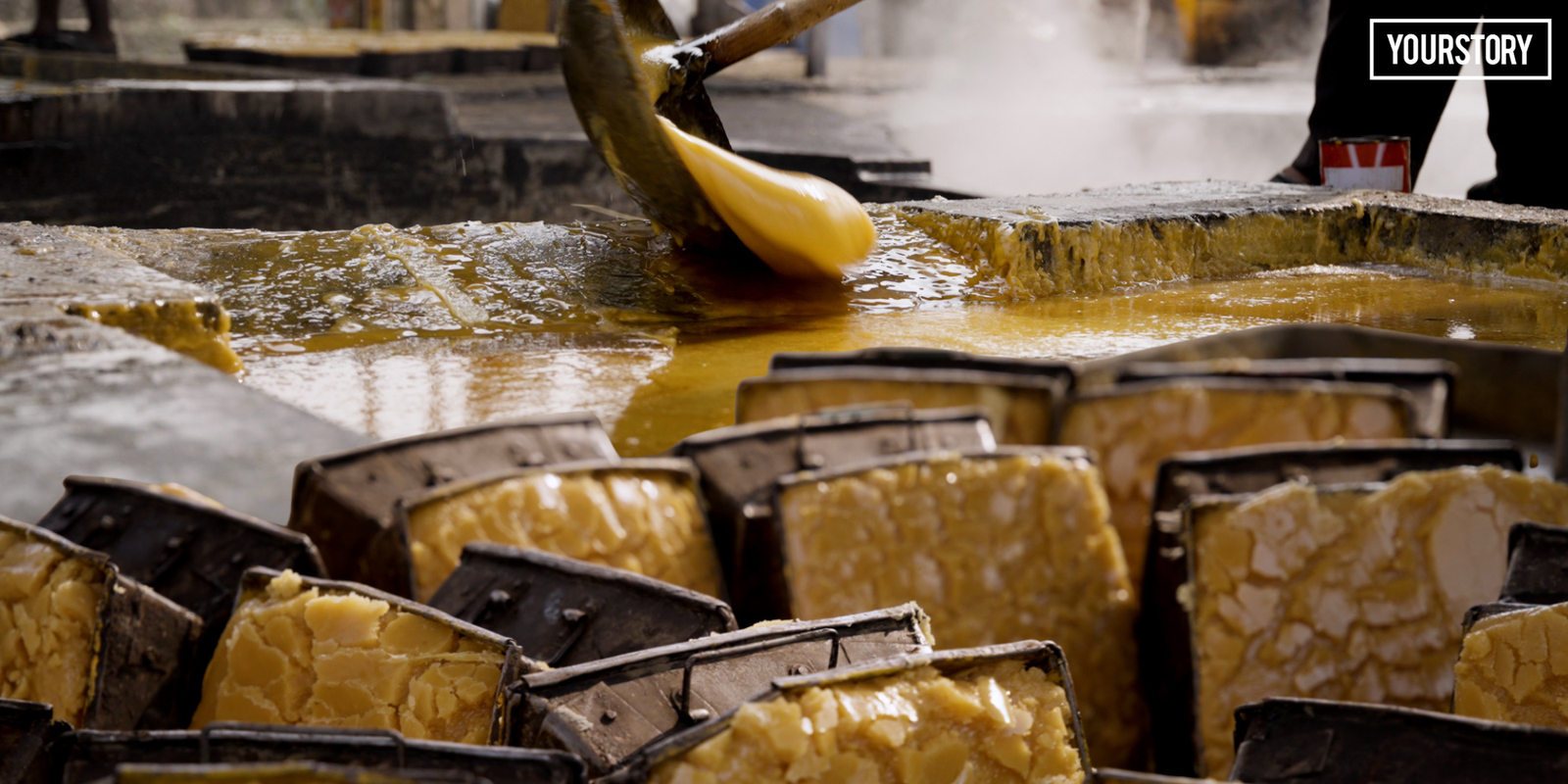 As the juice thickens, it is stirred continuously until it reaches the right consistency. The semi-solid mass is then poured into moulds or spread for cooling and setting. Once hardened, jaggery is shaped, stacked, and transported to the mandi.