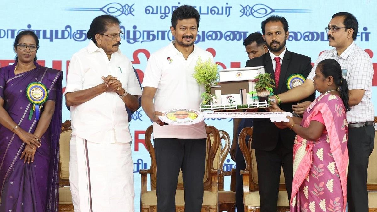 उपमुख्यमंत्री उदयनिधि स्टालिन शुक्रवार को तेनकासी में आयोजित एक समारोह में एक लाभार्थी को कल्याणकारी सहायता प्रदान करते हुए। | फोटो साभार: विशेष व्यवस्था