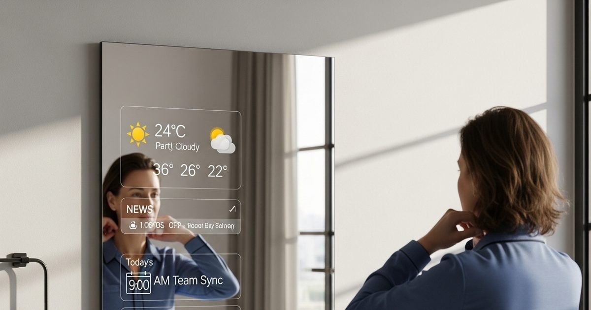 Smart mirror is actually a combination of a two-way mirror and a display. Viewed from the front, it looks like normal glass, but the screen behind it shows text and graphics. When white or bright information is shown on a screen with a black background, it is clearly visible through the glass. For this reason, it seems as if information about weather, news or calendar is visible directly on the mirror.