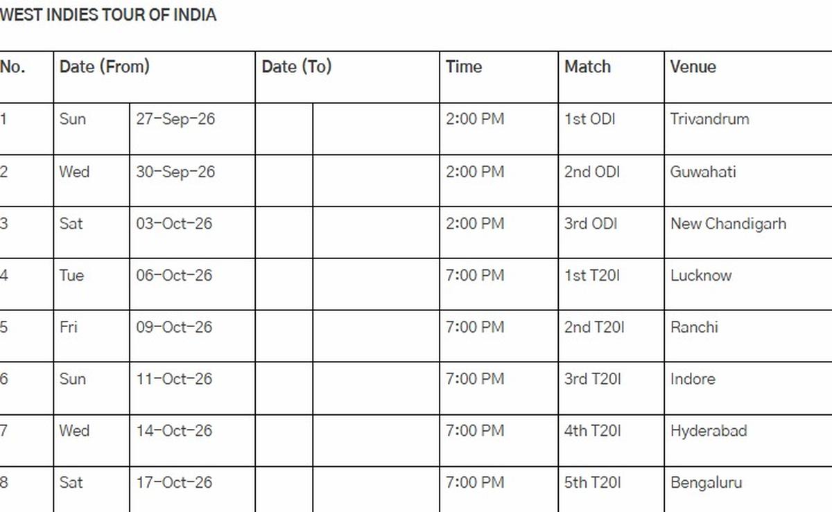 The season, comprising 22 international matches in 17 cities, will commence with the West Indies tour of India, starting on September 27. The tour will feature a three-match ODI series followed by a five-match T20I series. The ODIs will be played in Trivandrum, Guwahati, and New Chandigarh before the action shifts to the T20Is, which will be hosted across Lucknow, Ranchi, Indore, Hyderabad, and Bengaluru.