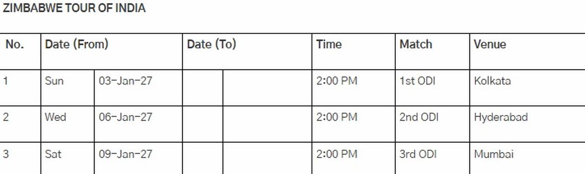 Zimbabwe will tour India for a three-match ODI series at the turn of the new year. The matches will be held in Kolkata, Hyderabad, and Mumbai.
