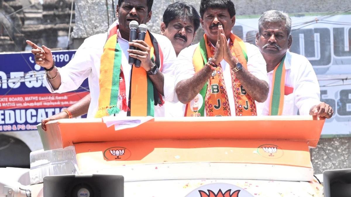 गुरुवार को रामनाथपुरम में एक चुनाव प्रचार के दौरान भाजपा नेता के. अन्नामलाई। | फोटो साभार: एल बालाचंदर
