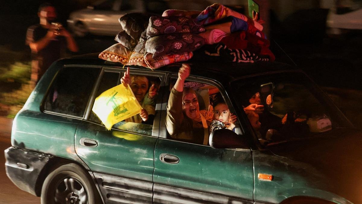 17 अप्रैल, 2026 को सिडोन, लेबनान में लेबनान और इज़राइल के बीच 10 दिवसीय युद्धविराम लागू होने के बाद विस्थापित लोग एक वाहन की छत पर सामान लेकर अपने घरों को लौटते समय प्रतिक्रिया व्यक्त करते हैं। फोटो साभार: रॉयटर्स