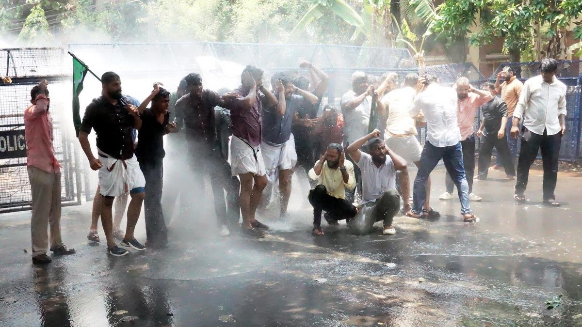 कन्नूर डेंटल कॉलेज के छात्र आरएल नितिन राज की मौत के आरोपियों के खिलाफ कार्रवाई की मांग को लेकर गुरुवार को कन्नूर शहर जिला पुलिस प्रमुख के कार्यालय तक विरोध मार्च निकालने वाले मुस्लिम यूथ लीग के कार्यकर्ताओं को हटाने के लिए पुलिस ने पानी की बौछार का इस्तेमाल किया। | फोटो साभार: एसके मोहन