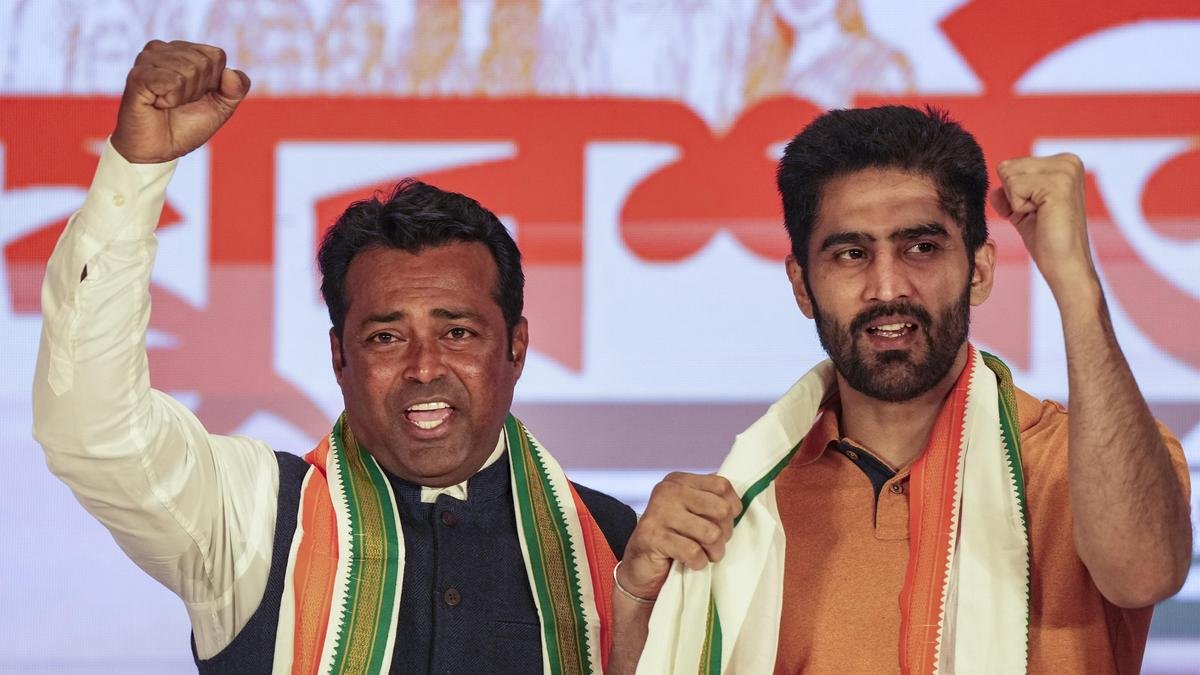 16 अप्रैल, 2026 को कोलकाता, पश्चिम बंगाल में भाजपा के युवा शक्ति कार्ड के लॉन्च के दौरान भाजपा नेता पूर्व टेनिस खिलाड़ी लिएंडर पेस और मुक्केबाज विजेंदर सिंह। फोटो साभार: पीटीआई