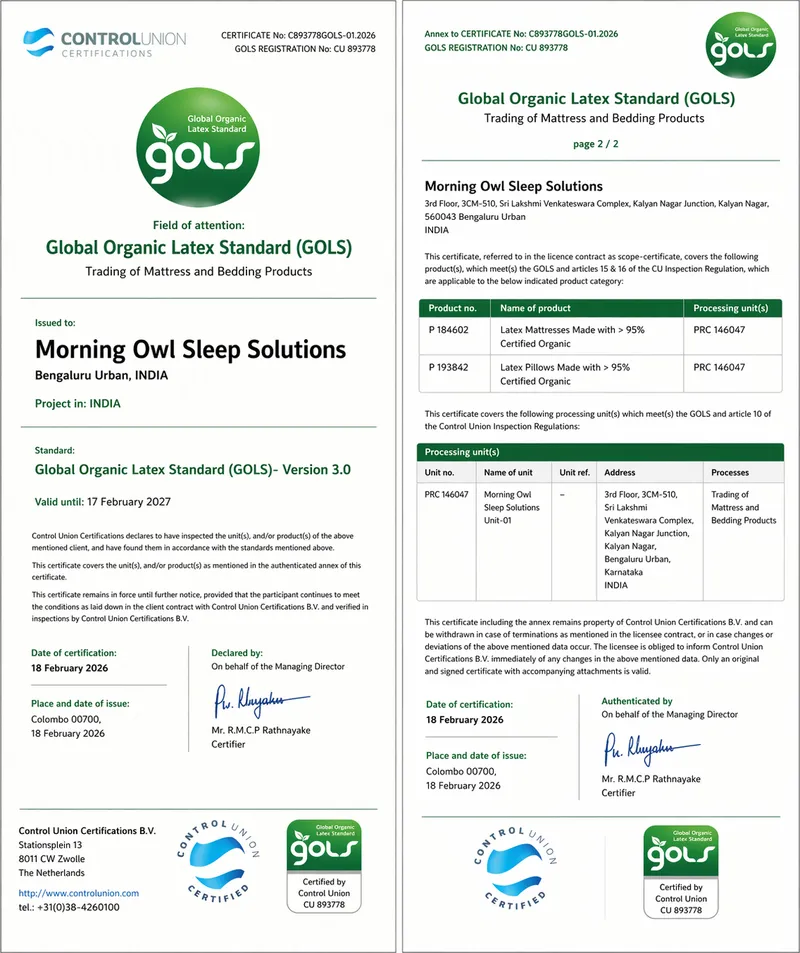 मॉर्निंग आउल ने लेटेक्स को अपनी पेशकश का गैर-परक्राम्य केंद्र बना दिया है। ब्रांड के गद्दे 100% प्राकृतिक डनलप लेटेक्स का उपयोग करते हैं और तीन विश्व स्तर पर मान्यता प्राप्त प्रमाणन प्रदान करते हैं: GOLS (ग्लोबल ऑर्गेनिक लेटेक्स स्टैंडर्ड), OEKO-TEX स्टैंडर्ड 100, और इको-इंस्टीट्यूट। साथ में, वे विश्वास समीकरण के विभिन्न हिस्सों को संबोधित करते हैं: जैविक सोर्सिंग, हानिकारक पदार्थों की परीक्षण की गई अनुपस्थिति, और कम उत्सर्जन वाले तैयार उत्पाद।