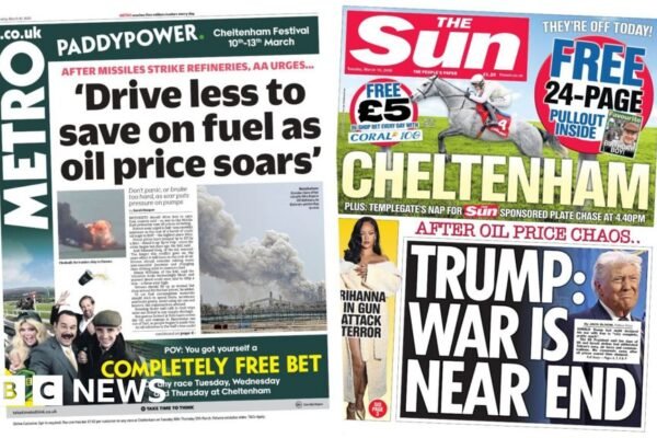 विशेषज्ञों की चेतावनी है कि ईंधन प्रति लीटर 2 पाउंड तक पहुंच सकता है और ट्रम्प का यह कहना कि ईरान युद्ध अपने अंत के करीब है, मंगलवार के अख़बारों में प्रमुख है। Source link